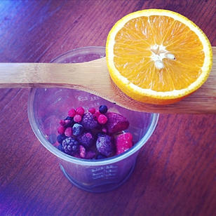- Handje diegevroren rood fruit: aardbeien, frambozen, kersen, bramen, rode en blauwe bessen (tip: doosje zomerfruit)