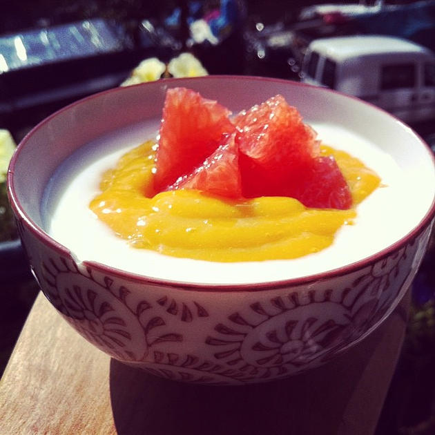 Of ik van mango houd kan met de dag verschillen. Of met de mango, misschien. Best case: zoet, tropisch, beelden van palmbomen en zandstranden.. Maar soms smaken ze een beetje weeïg en draderig, net niet lekker. Oplossing: puree van maken! Met romige geitenyoghurt (maar kan ook andere yoghurt zijn natuurlijk) en frisbittere grapefruit een verrassend eenvoudig ontbijtje/tussendoortje/toetje :).