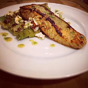 Doe boter in een koekenpan en zet een grillpan op hoog vuur. Leg de stukken prei in de grillpan en laat ze aan twee kanten mooie bruine grillstrepen krijgen. Bak ondertussen de zalmfilets in hun marinade in de koekenpan. Ze hebben maar 2 a 3 minuten per kant nodig (afhankelijk van hoe dik ze zijn natuurlijk) om van buiten mooi lichtroze en van binnen nog glanzend rose te zijn.