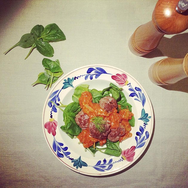 Doe twee handen spinazie (rauw dus) op een bord, leg de burgers erop en lepel er flink wat van de tomaten-venkelsaus overheen. Maak naar smaak af met wat citroensap of misschien een likje yoghurt voor de frisheid.