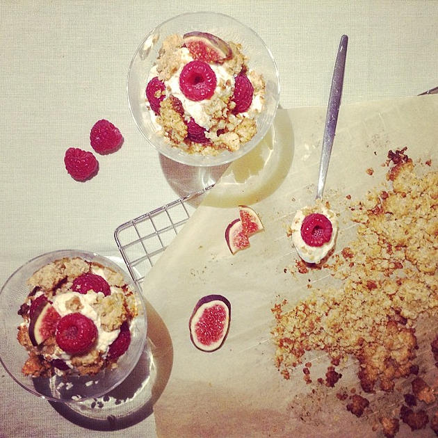 Dit dessert mag ik niet onder de noemer ‘gezond’ hangen, maar het kan absoluut een stuk ongezonder. Met de combinatie van mascarpone en frambozen kan sowieso weinig misgaan; voeg room en een boterzachte crumble toe en je hebt een fijn toetje om bij weg te dromen. Het is niet zo zoet (zonder geraffineerde suikers), dus als je het lekker vindt kun je wat rietsuiker of extra honing toevoegen in zowel het mascarponemengsel als de crumble. Snelle variant? Vervang de crumble door countrycookies of speculaas! Feelings of guilt? Combineer met de spinazie-cashew salade 😉