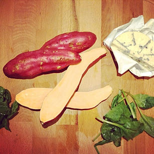 In mijn eeuwige haat-liefdeverhouding met koolhydraten komt er zo nu en dan een fijn alternatief voor aardappel bovendrijven, meestal in de vorm van knolgroenten. Dit keer werd ik verleid door mooie donkerroze zoete aardappels! Oorspronkelijk plan: maak er frieten van. Maar een grote zak spinazie in onze koelkast en een stuk blauwe kaas brachten me op een herfstiger idee: een zoete (aardappel-)puree met pit. De burgers die bij de friet zouden komen mochten wel aanhaken bij dit nieuwe plan ;). Tip: eet de drie elementen van dit recept vooral samen in één hap: zoete aardappelpuree, bittere spinazie en kruidig lamsvlees met een tik van de blauwe kaas. Comforting!