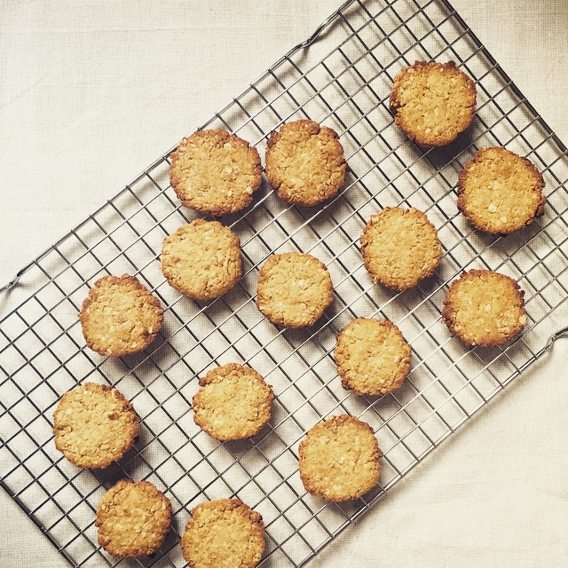 Dit recept ontstond toen ik een batch granola had gemaakt die nogal knapperig was geworden. Ik dacht: daar moet ik een koekje van kunnen maken. Uit de losse pols gooide ik wat ingrediënten door elkaar en tot mijn verrassing was daar een stevig, niet al te ongezond koekje dat doet denken aan die country-biscuits uit de winkel. Ik vond dat ze eerst moesten afkoelen voordat we ze zouden opeten, maar dat is niet gelukt..