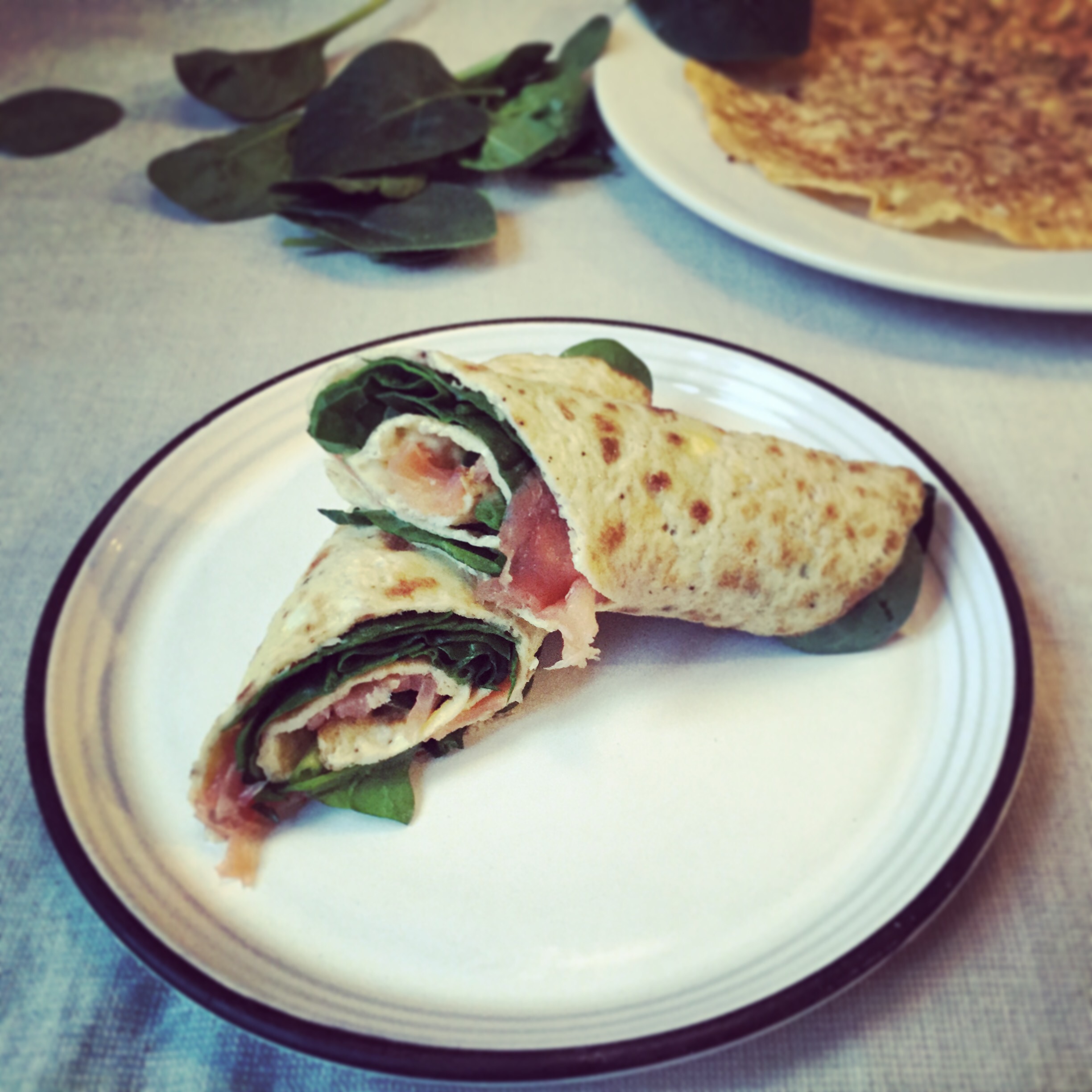 Een simpel maar lekker lunchgerechtje. Ook prima mee te nemen, mits je de zalm niet al te lang buiten de koelkast bewaart. De kunst is wel het flensje zo dun mogelijk te maken zonder dat ‘ie uit elkaar valt; anders wordt het meer een omelet. Of mislukte roerei 😉