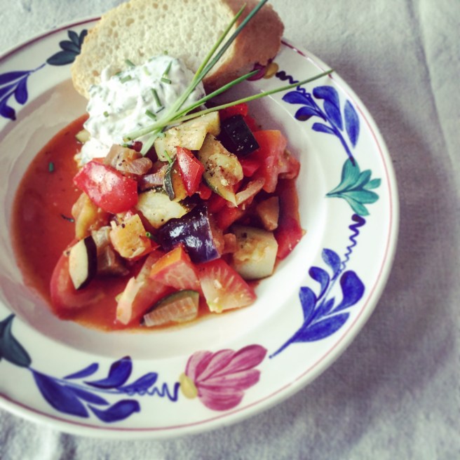 Meng ondertussen Griekse yoghurt met bieslook en zout en peper. Schep de ratatouille op een diep bord met een goede schep yoghurt erbij en dip er een knapperig broodje in :). Voila.
